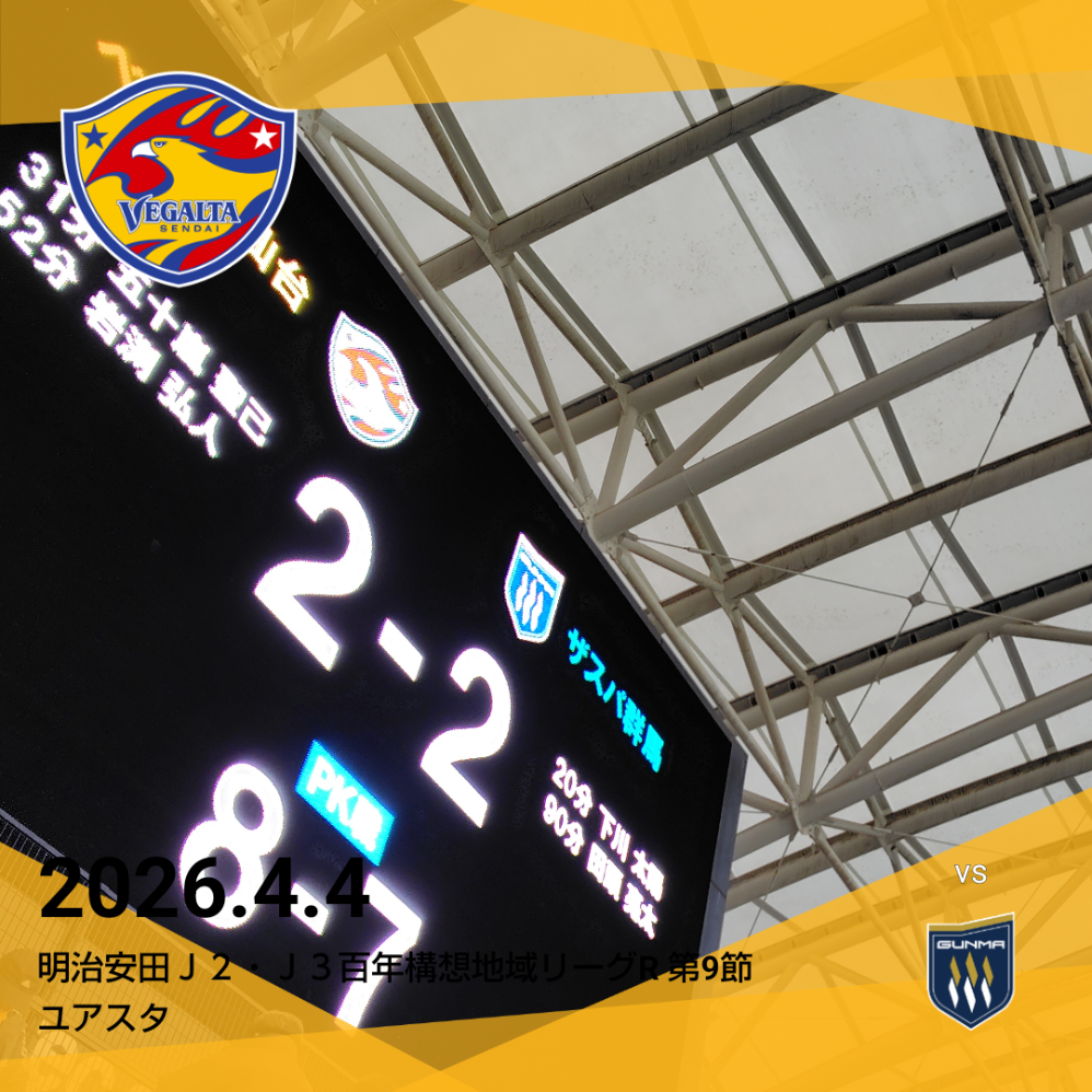 2026年4月4日(土)にユアテックスタジアム仙台で開催される、第9節・ベガルタ仙台対ザスパ群馬の一戦 この試合でリーグ対戦相手との1巡目が終了 現在、首位を走るベガルタ仙台(勝点21)に対し、ザスパ群馬(勝点6)は10位と苦しい状況が続いている。 その群馬「首位叩き」で流れを変えられるか?というところ