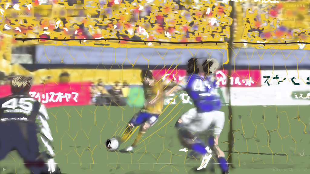 しかし歓喜が訪れたのは85分、山形が攻勢をかけたベガルタゴール前のボールをひゅいっとかっさらうと、そこからウナギ犬のごとくにゅるにゅると駆け上がる、途中武田選手とのテクニシャン同志ワンツーをかましてゴール前に侵入