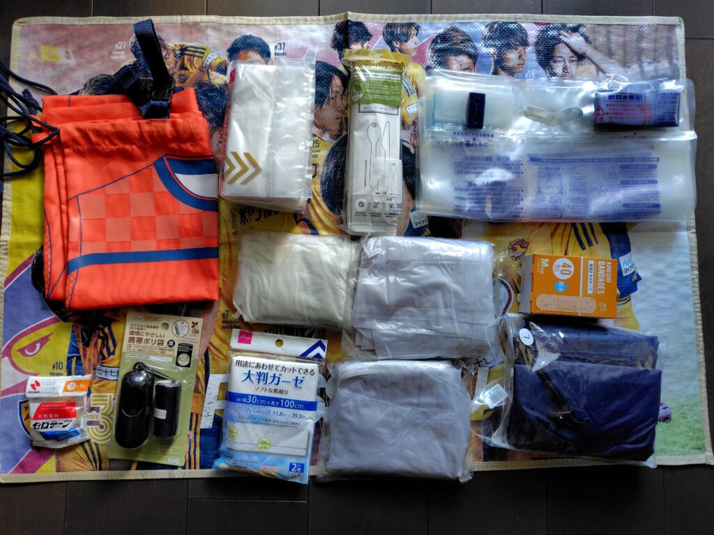 ⑲スプーン、⑳簡易ポリタンク、㉑カッパ、㉒ガーゼ、㉓簡易ポリ袋、㉔セロテープ、㉕テッシュ、㉖カットバン、㉗大宮アルディージャのナップザック(笑)